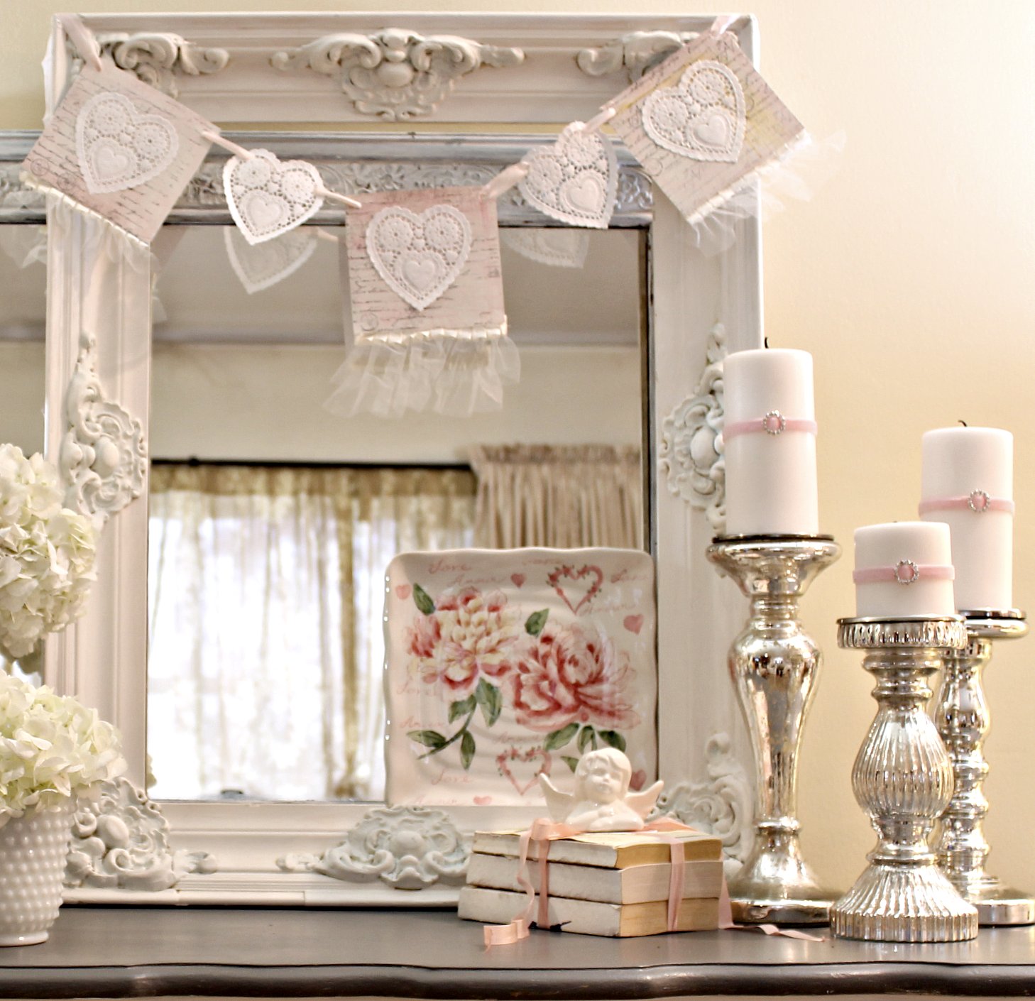 20. Beautiful vignette! Love the little heart banner and the candlesticks are so pretty too! Just gorgeous!