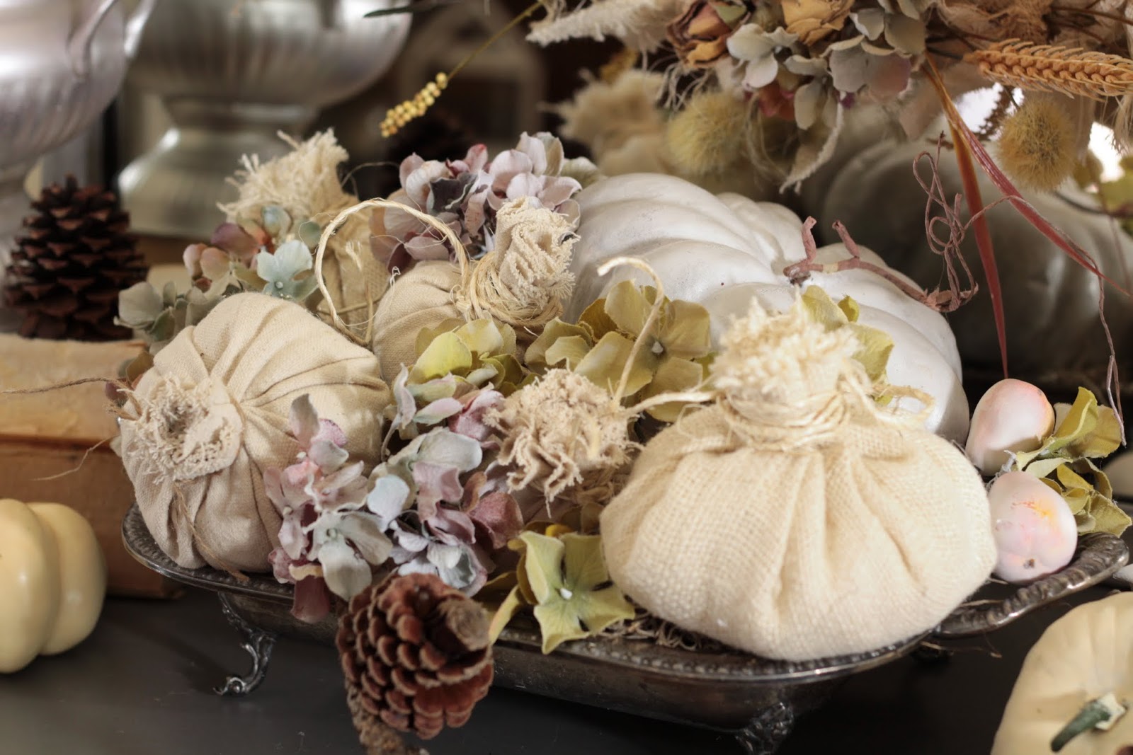 Since most of my stash is in vibrant fall colors I picked out the few muted colors I have, my white pumpkins, made a few canvas and burlap pumpkins and spray painted a couple white. Then I decided to use my vintage silver, some thrift store books with the covers ripped off and my urn that I painted silver a while ago.